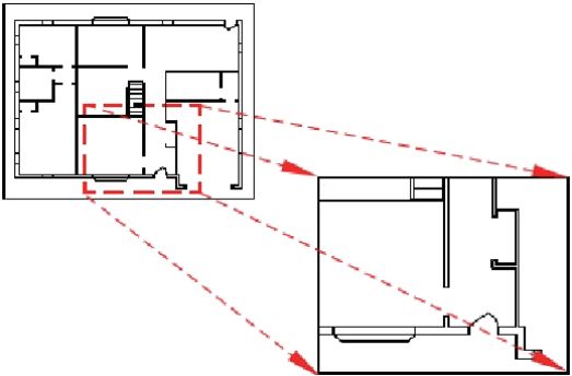 如果設計者繪製 2D 房屋,為了要精確的放置窗戶及門,使用者必須縮放特定區域。