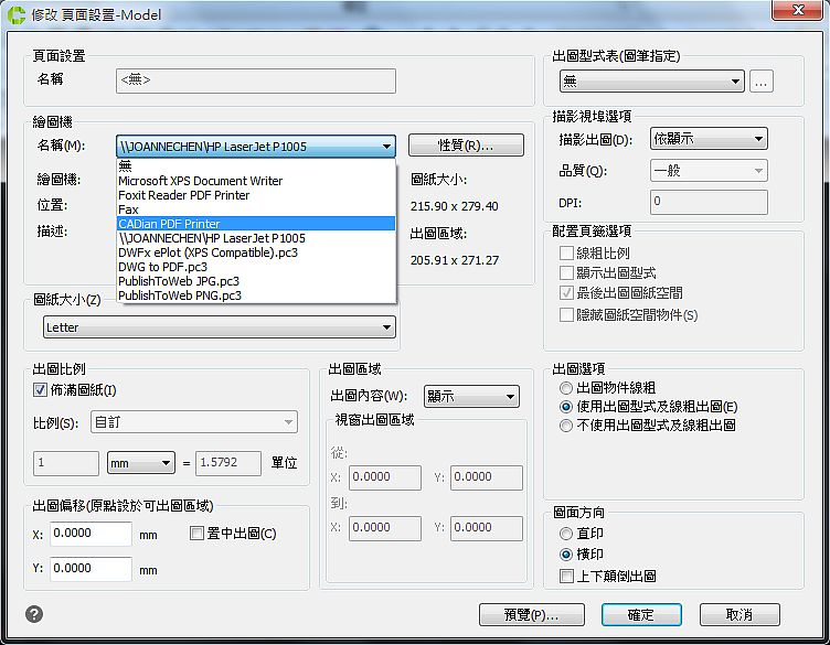 3、此例中,選擇[Model],並按下[修改],即可修改設定値,以便下次直接使用該頁面設置出圖,節省重複更改設定的時間。