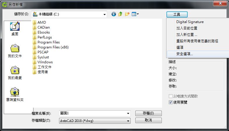 才可以開啟,設定方式如下,當您另存新檔時,點擊對話窗右上方的 [工具]按鈕,再點擊下拉選項中的[安全選項]