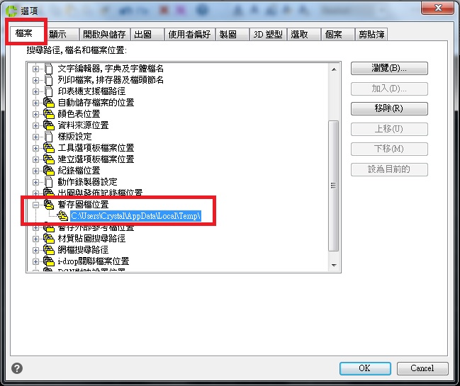 在[選項]視窗中,移至 [檔案]頁籤,點開 [暫存圖檔位置]即能看到暫存檔存放的路徑,當CADian 或是Windows當機時,使用者可以去該路徑,將*.SV$的檔案更名為*.DWG的副檔名,即可回復最即時的內容。